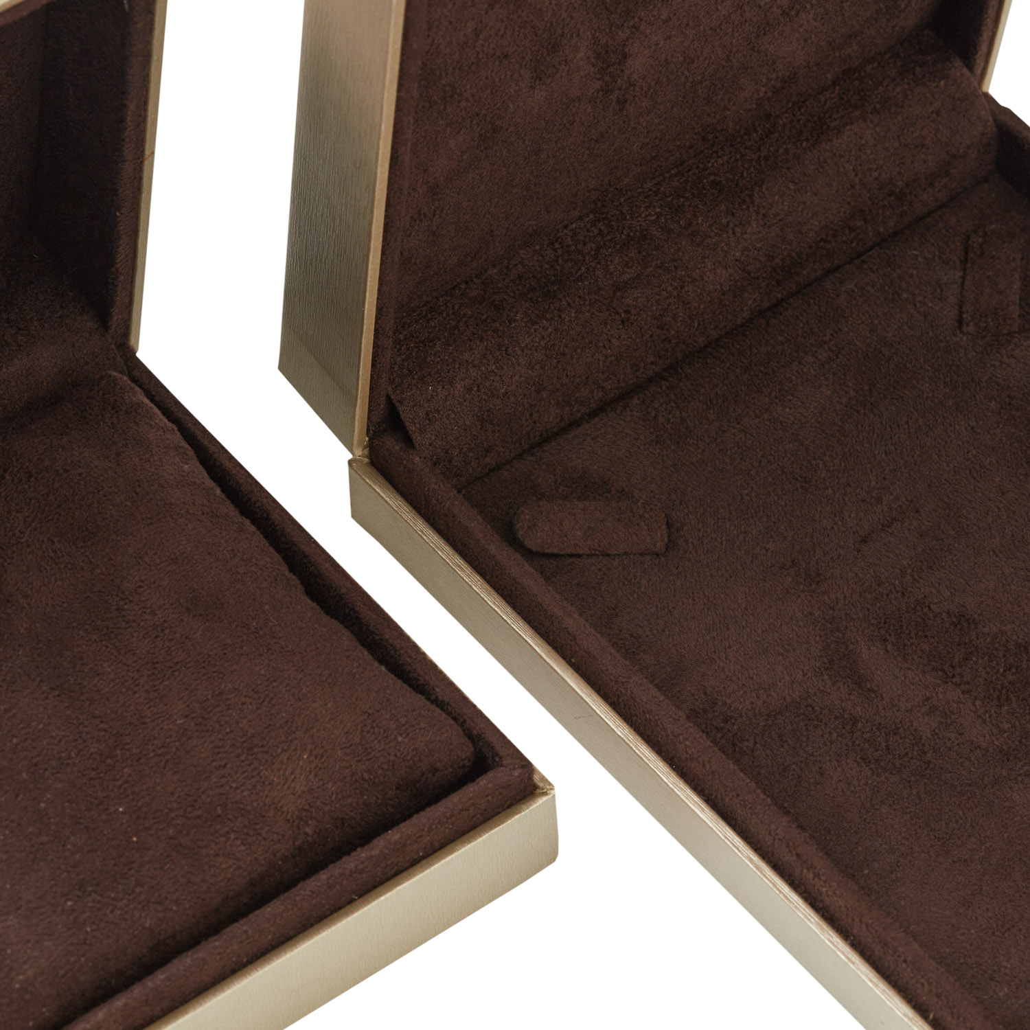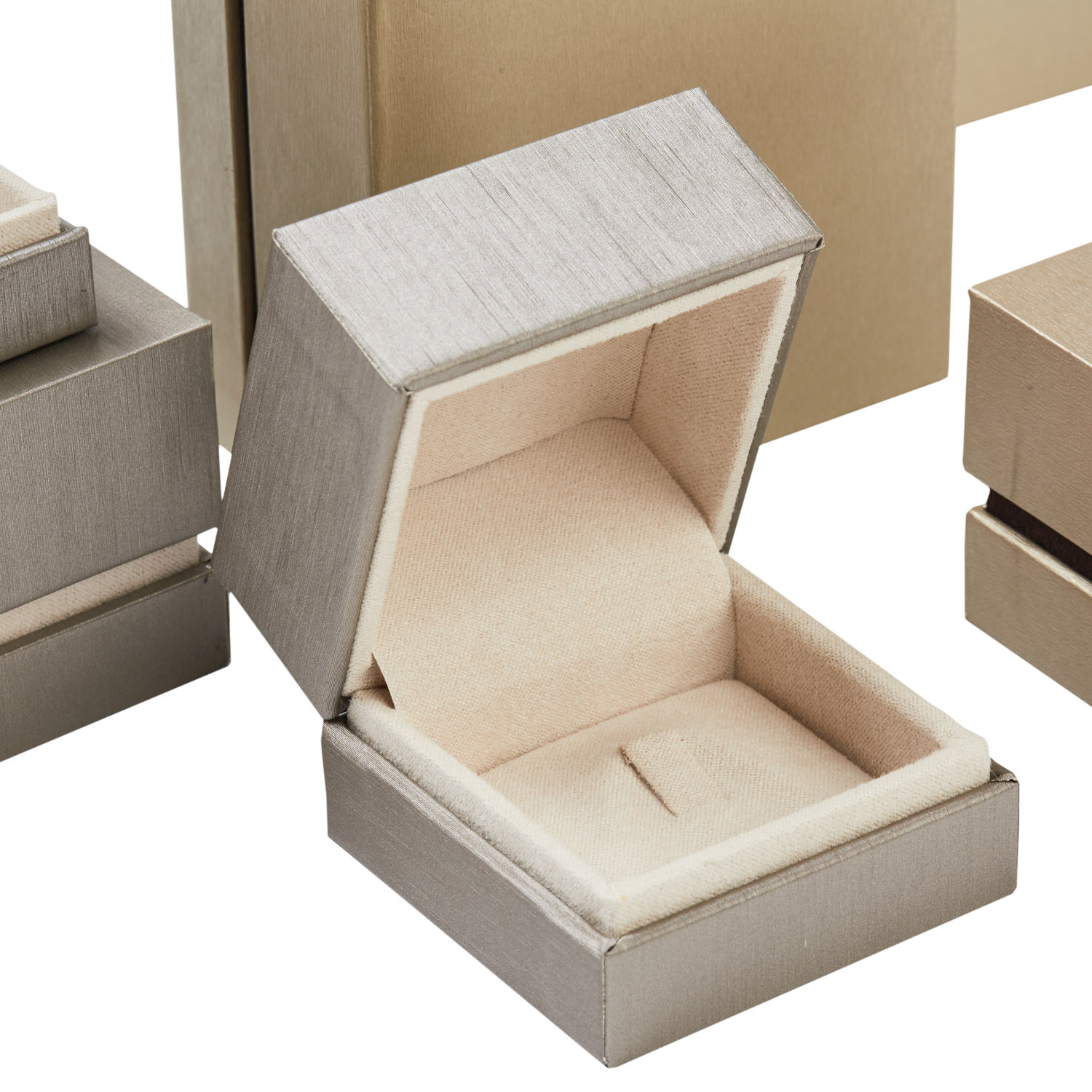 Cases with chest opening case covered outside in iridescent embossed paper and inside in microfiber material.